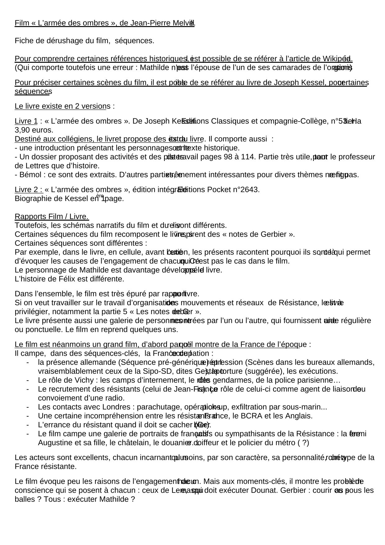 Si on veut travailler sur le travail d’organisation des mouvements et réseaux de Résistance, le livre est à privilégier, notamment la partie 5 « Les notes de Gerbier ». Le livre présente aussi une galerie de personnes rencontrées par l’un ou l’autre, qui fournissent une aide régulière ou ponctuelle. Le film en reprend quelques-uns.