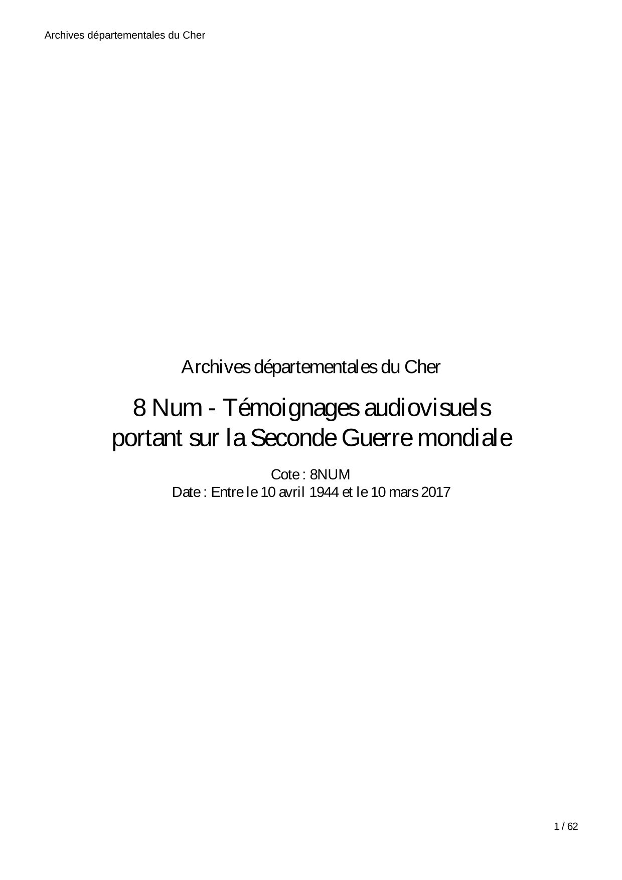 Près de 270 documents audiovisuels en lien avec la Seconde Guerre mondiale dans le département du Cher sont entrés dans les fonds, le plus souvent sous forme numérique. Près d’une centaine de ces documents sont des témoignages collectés par l’équipe du musée, le reste comprend des témoignages recueillis plus anciennement par les associations de mémoire mais aussi par des élèves dans le cadre Concours national de la Résistance et de la Déportation. On dénombre également des documentaires, dans lesquels le musée a pu être partenaire, et des créations audiovisuelles.