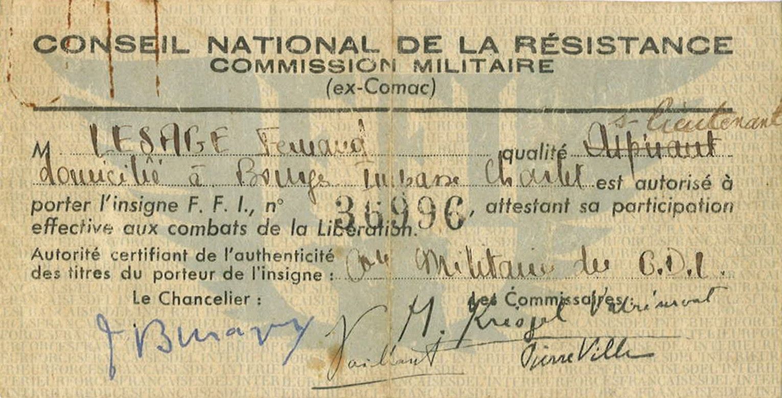 Réfractaire au S.T.O., il se réfugie en février 1943 à Bué (Cher) où il forme un groupe de résistance F.T.P.F qui se place sous le commandement de Roland Champenier. Arrêté par les Allemands alors qu’il effectue une mission de récupération d’armes à Saint-Satur le 29 avril 1944, il est ramené à la prison du Bordiot à Bourges et torturé par Paoli. Il s’évade de la voiture cellulaire qui le ramène d’un interrogatoire le 22 mai 1944 et passe dans la Nièvre où il reprend le combat en rejoignant à Roland Champenier, replié à Donzy. Fernand Lesage est de retour dans le Cher en juillet 1944 avec le détachement F.T.P.F. « Liberté », commandé par le capitaine « Camille ». Il est promu sous-lieutenant le 1eraoût 1944 et prend le commandement du détachement. Il participe aux combats de la libération de Vierzon, puis s’engage pour la durée de la guerre le 30 septembre 1944.