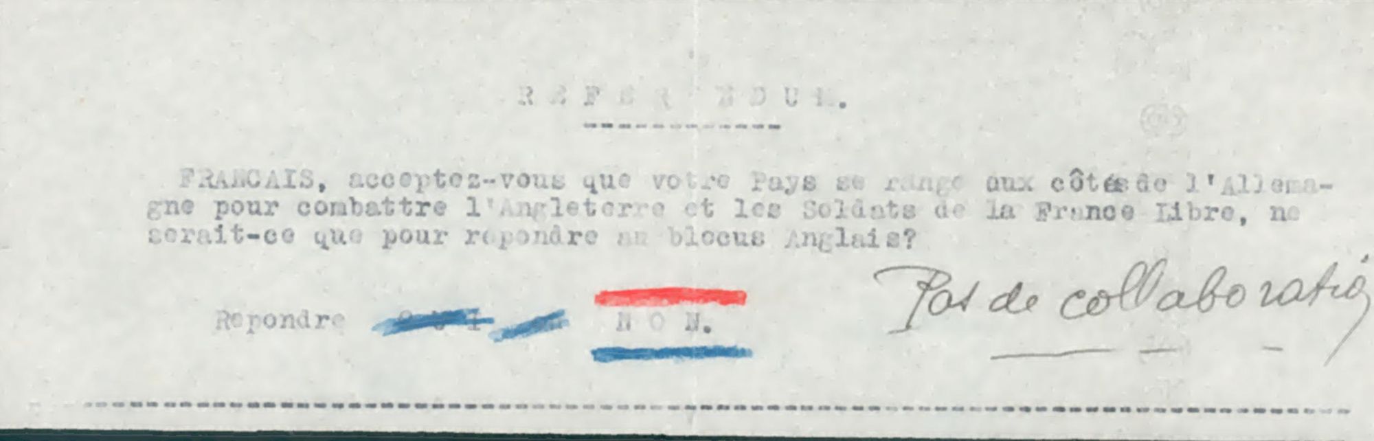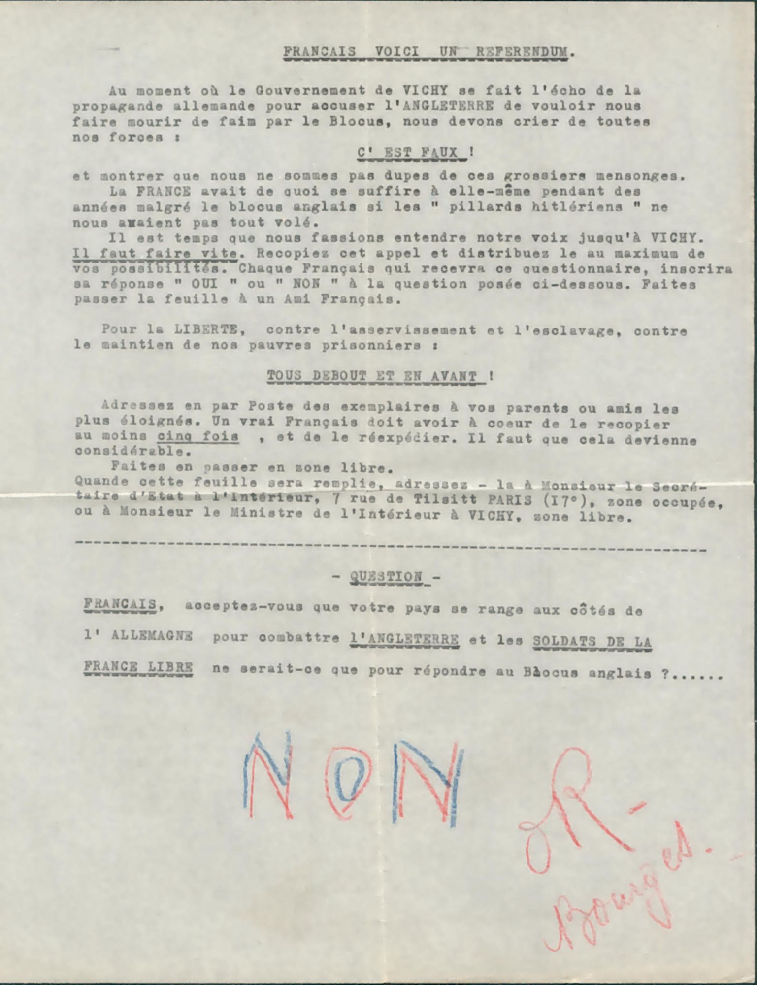 Au printemps 1941, ils réalisent un référendum sur la politique de collaboration dont ils demandent d’adresser les réponses au secrétaire d’Etat à l’Intérieur. 38 réponses postées depuis le Cher ont été interceptées par la police mobile d’Orléans.