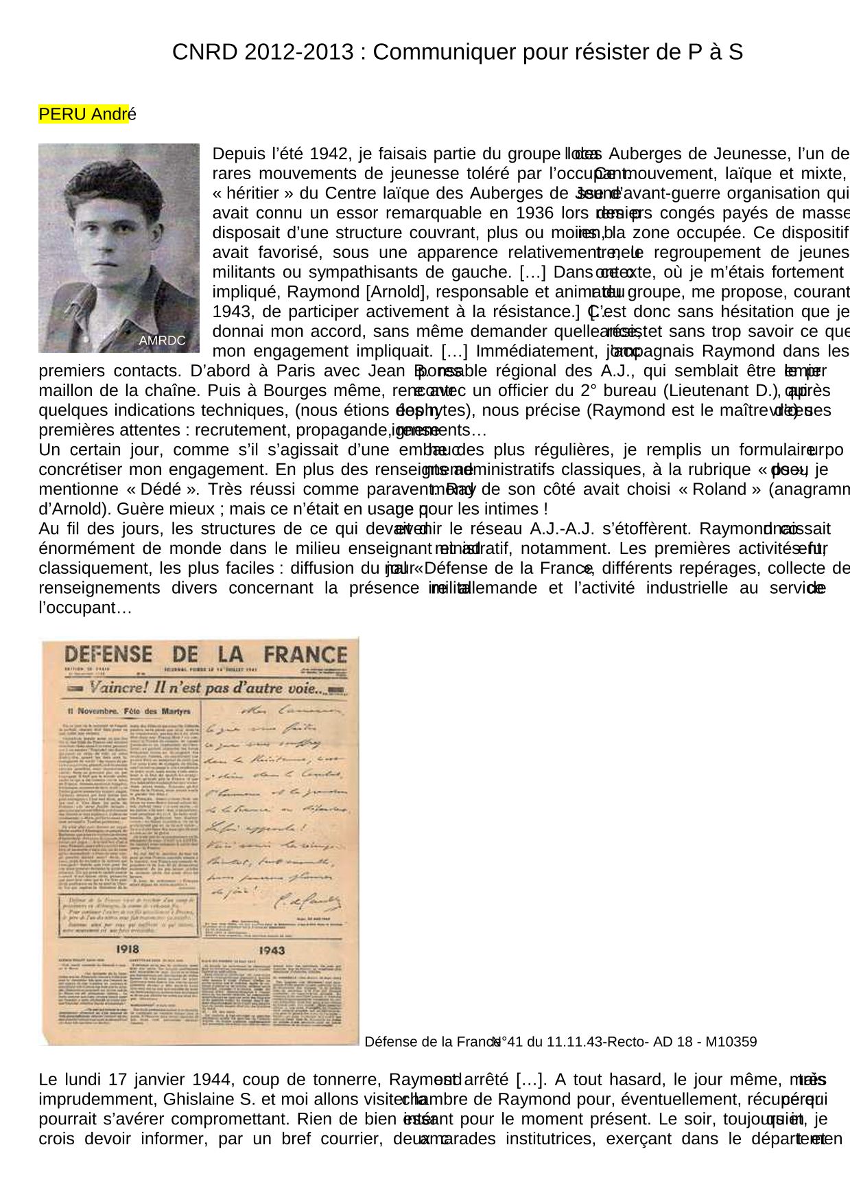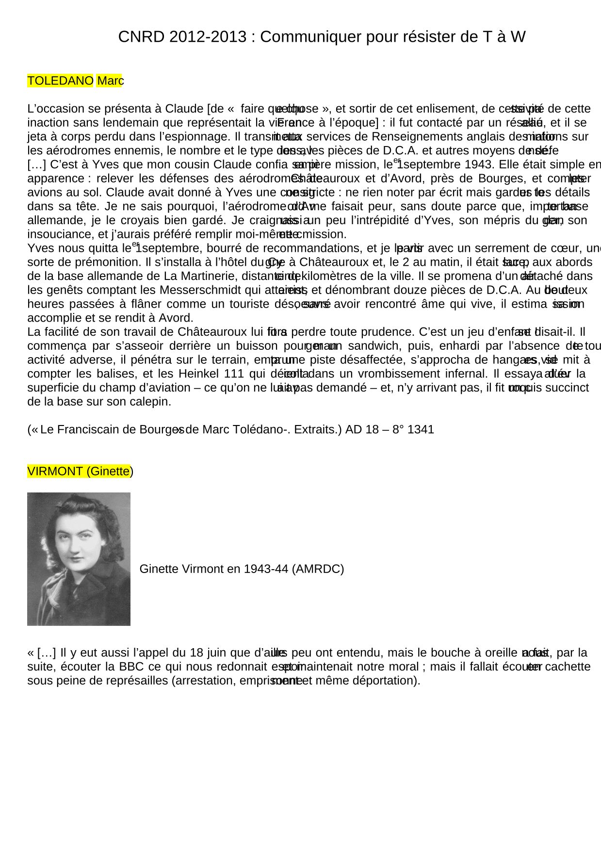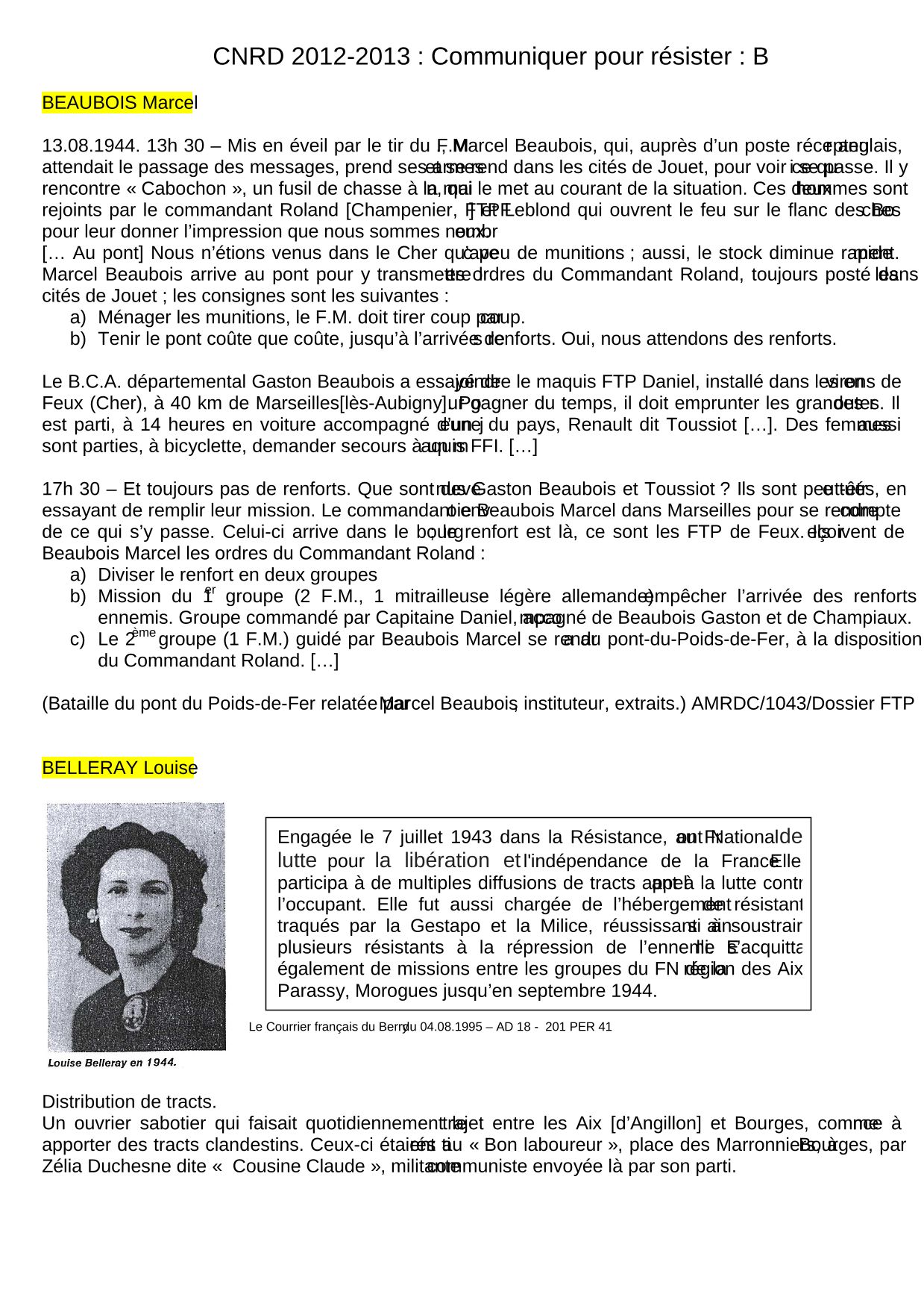 2012-2013 Communiquer pour résister Témoignages de Résistants et Déportés du Cher Témoignages-CNRD 2012-13_A.pdf (6.1 Mo) Témoignages-CNRD 2012-13_ B.pdf (2.0 Mo) Témoignages-CNRD 2012-13_C.pdf (4.9 Mo) Témoignages-CNRD 2012-13_D.pdf (3.0 Mo) Témoignages-CNRD 2012-13_F à M.pdf (6.6 Mo) Témoignages-CNRD 2012-13_P à S.pdf (1.0 Mo) Témoignages-CNRD 2012-13_ T à W.pdf (2.0 Mo)