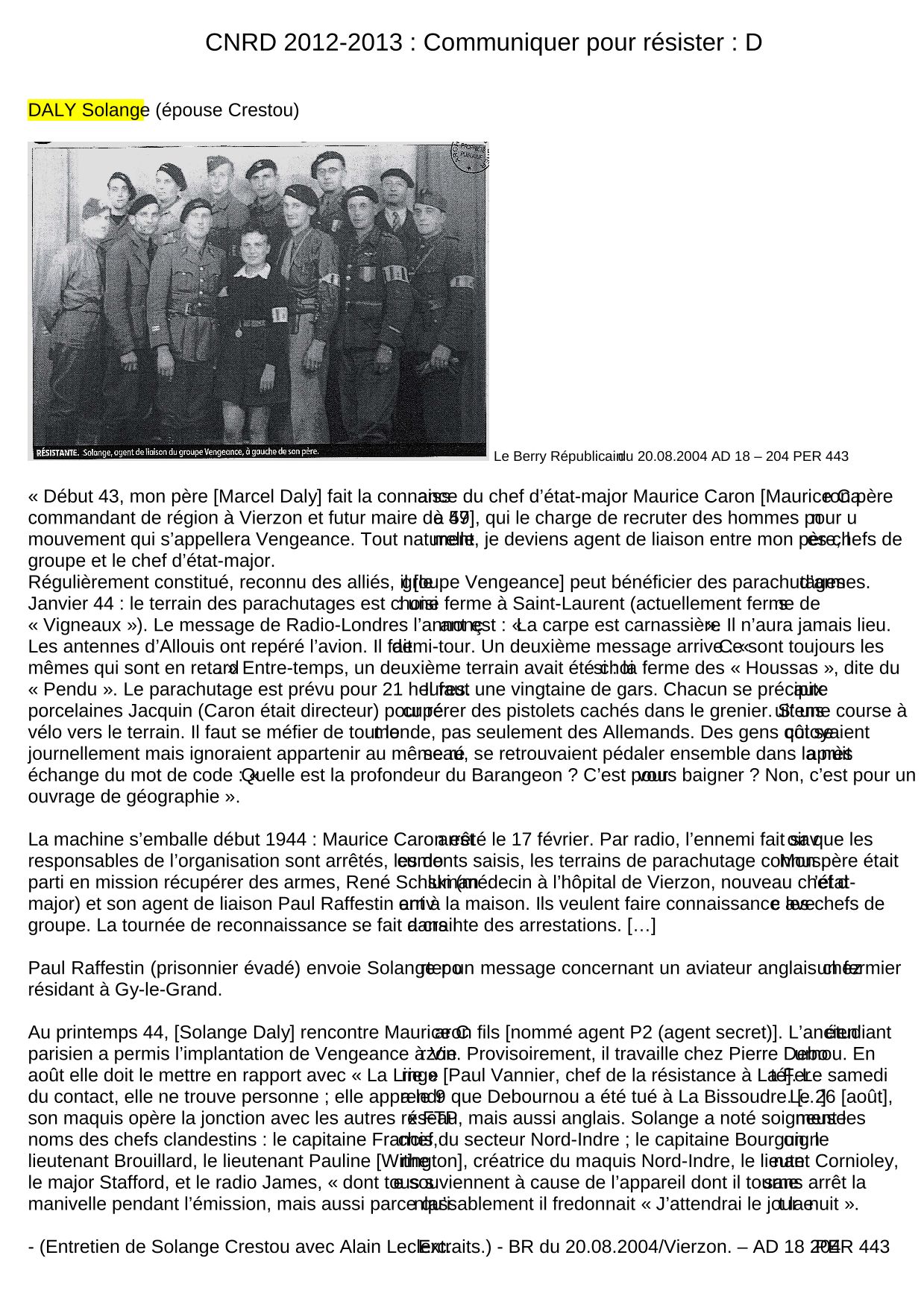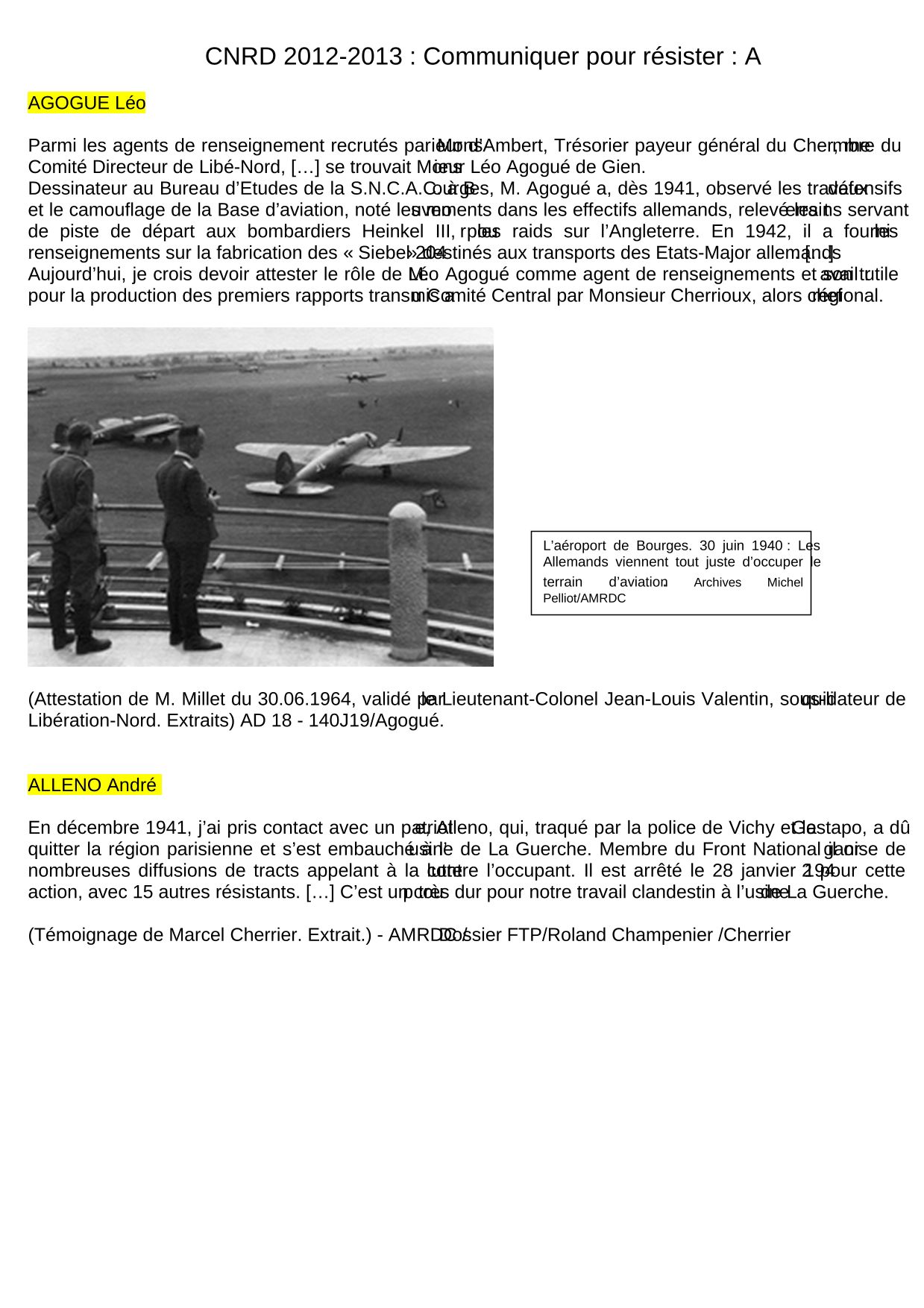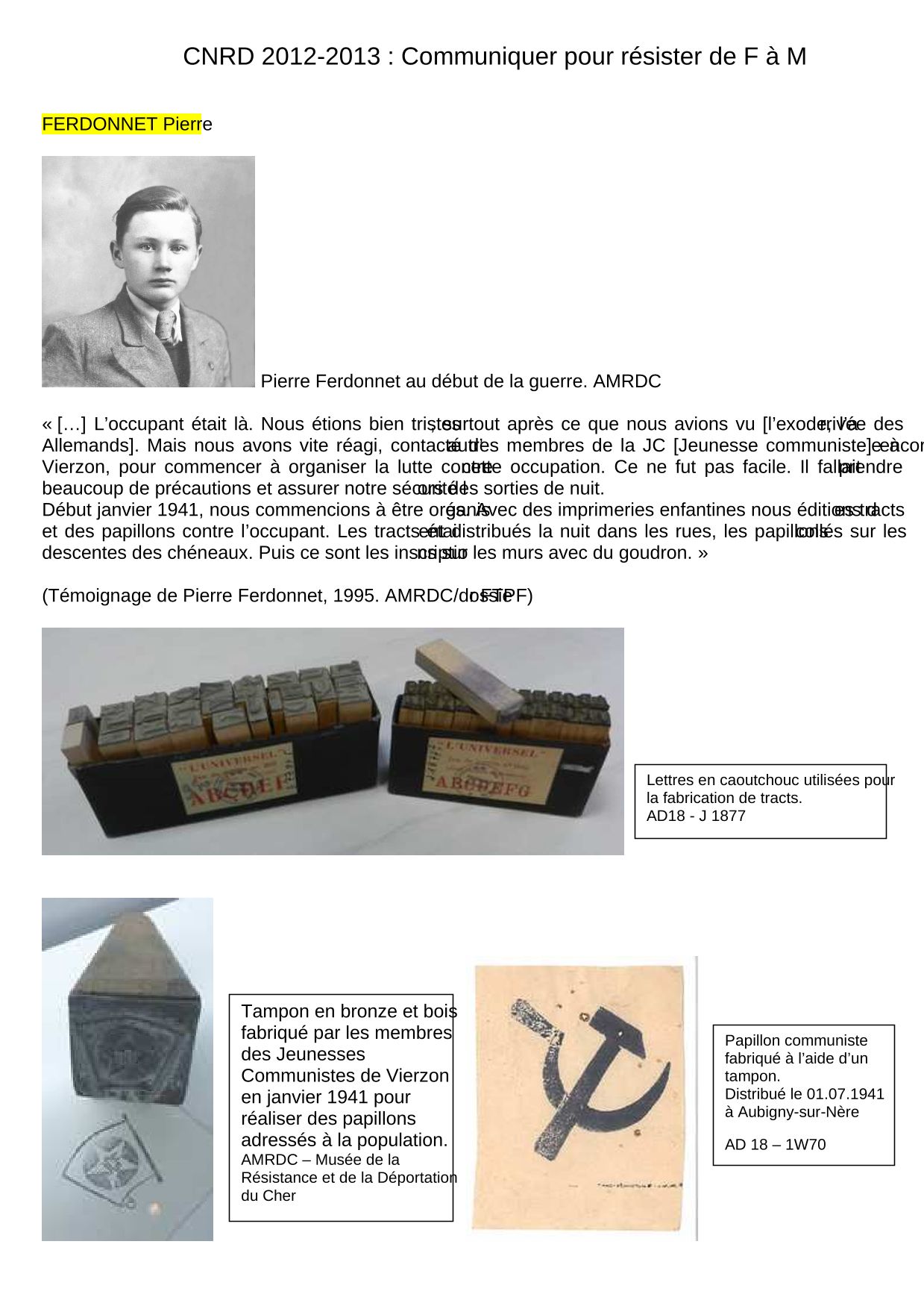 2012-2013 Communiquer pour résister Témoignages de Résistants et Déportés du Cher Témoignages-CNRD 2012-13_A.pdf (6.1 Mo) Témoignages-CNRD 2012-13_ B.pdf (2.0 Mo) Témoignages-CNRD 2012-13_C.pdf (4.9 Mo) Témoignages-CNRD 2012-13_D.pdf (3.0 Mo) Témoignages-CNRD 2012-13_F à M.pdf (6.6 Mo) Témoignages-CNRD 2012-13_P à S.pdf (1.0 Mo) Témoignages-CNRD 2012-13_ T à W.pdf (2.0 Mo)